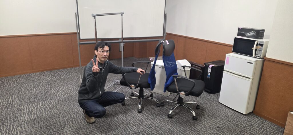 今回の作業前のお写真には、白い事務デスク天板、OAチェア、移動式ホワイトボード、ハンガーラック、パソコン機器、プリンター、ゴミ箱、小型冷蔵庫、電子レンジなどが並び、