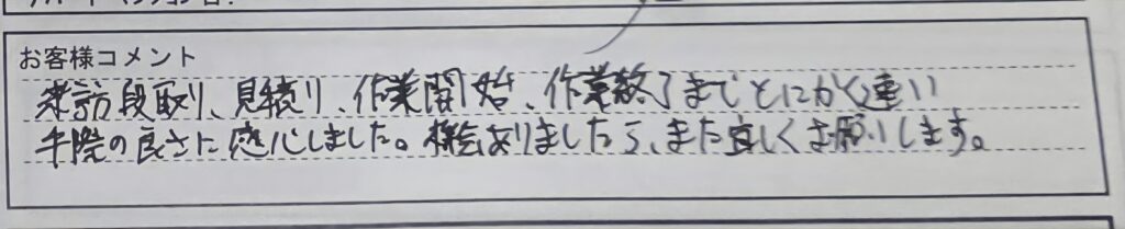 「来訪段取り、見積り、作業開始、作業完了までとにかく速い!! 手際の良さに感心しました。機会ありましたら、また宜しくお願いします。」