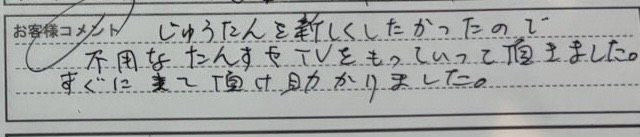 【じゅうたんを新しくしたかたので不用なタンスやTVをもっていって頂きました。すぐに来て頂けて助かりました。】