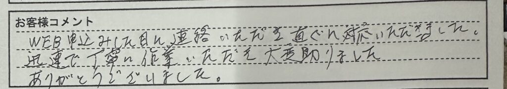 「Web申し込みした日に連絡いただきすぐに対応いただきました。迅速で丁寧に作業いただき大変助かりました。ありがとうございました。」